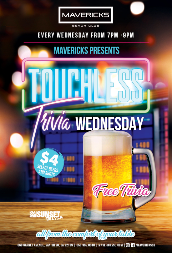 Wednesday Touchless Trivia – $4 Select Beers and Shots Touchless Trivia – $4 Select Beers and Shots 7PM – 9PM + Add to Google Calendar + iCal / Outlook export 00 days 00 hours 00 minutes 00 seconds Date Dec 10 2025 Time 7:00 pm - 9:00 pm Category Specials Share this event